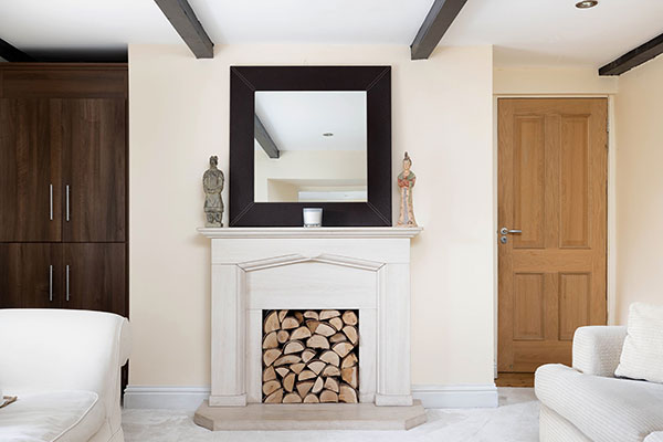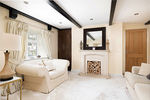 Sitting room (4.23 x 3.38m): off entrance hall and overlooking front garden, with carpet, pole-mounted curtains, original period timber ceiling beams and feature fireplace with open fuel-burning grate, marble hearth, surround and mantel, and built-in alcove press
