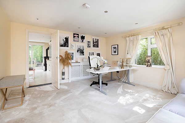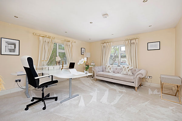 Home office (4.81 x 4.4): dual aspect space off sitting room, with windows overlooking front garden and side of house, with carpet, pole-mounted curtains, radiator with bespoke cover and recessed LED ceiling lights
