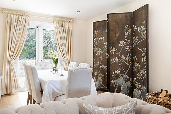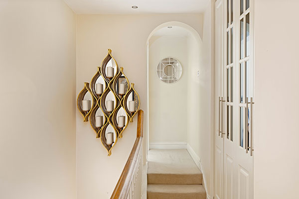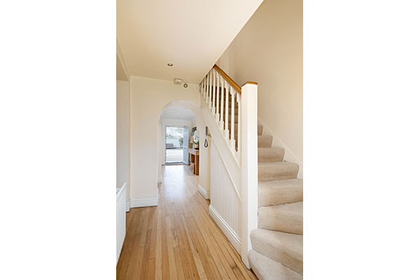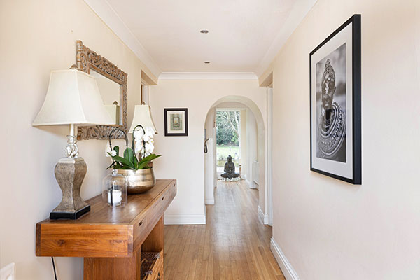 On stepping into the spacious entrance hall, there’s an eye-catching vista through an archway and on through a high window at the far side of the house into the back garden.