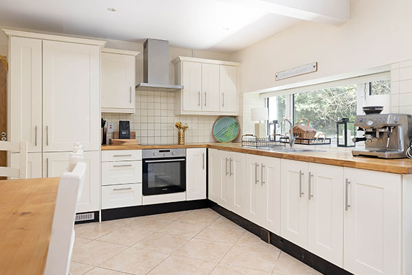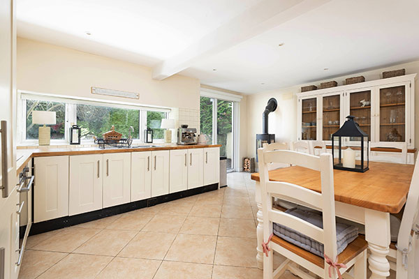 A real standout is an exceptionally large kitchen measuring over 260 square feet, fitted out along three walls with pristine contemporary storage, with extensive butcher-block counter top space and integrated appliances. Heating this large but toasty family living space is a solid fuel burning Stanley stove.