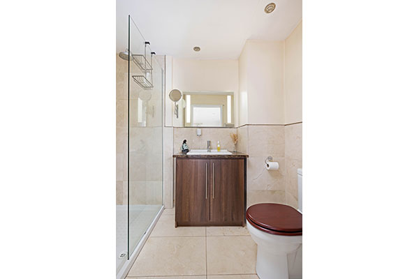 Ensuite bathroom (2.38 x 1.64): contemporary style ensuite off Bedroom 3, with WC, WHB with integrated cabinet and mirror above, tiled floor, half wall-height tiling and large walk-in shower with ceiling-height tiled surround, glass shower screen and rainforest shower