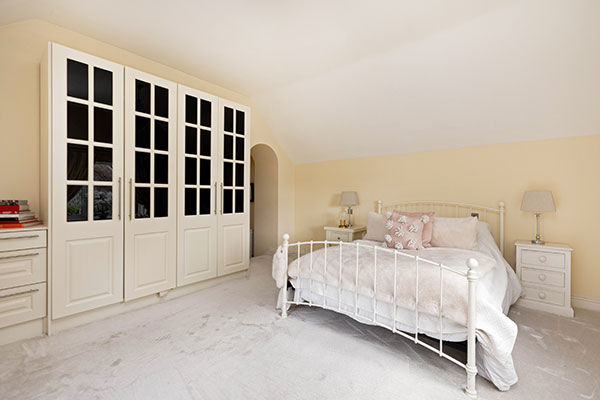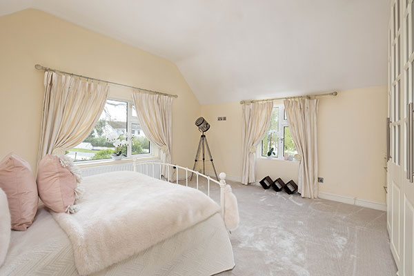 Bedroom 2 (4.86 x 4.34 + 1.86 x 1.38m): dual aspect room overlooking front garden and side of house, with arched entry way, ensuite bathroom, carpet, pole-mounted curtains, roof-height ceiling, hanging pendant style ceiling light and full-wall, built-in storage comprising press with drawers and wardrobes on either side