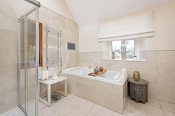 Main bathroom (3.18 x 3.17): contemporary style bathroom, with WC, WHB, tiled floor, half wall-height tiling, heated towel rail, Jacuzzi bath and large walk-in corner shower with ceiling-height tiled surround, glass shower screen and rainforest shower